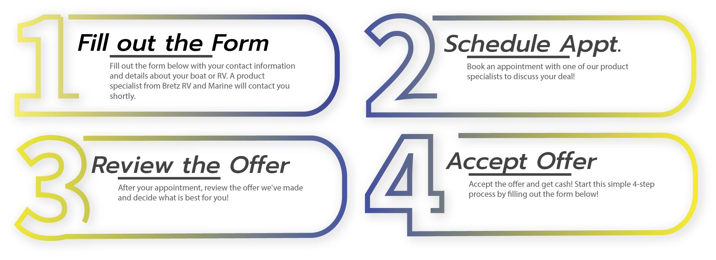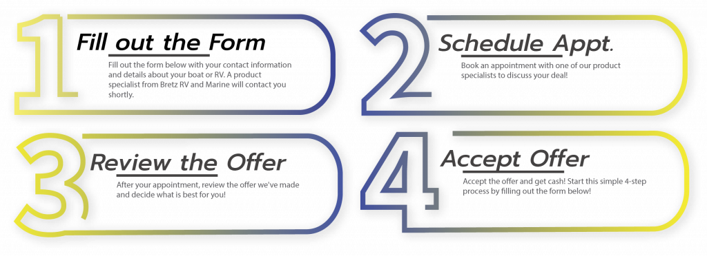 No matter the make or the model of your Boat or RV, Bretz RV & Marine is interested in buying it! Don’t believe us? The national shortage of RVs and Boats means you are guaranteed to receive our absolute top dollar. If you are looking to sell your boat or RV, please review our super simple 4-step process below, and let us make you an offer! We’ll even pay you cash! We look forward to meeting you soon and learning more about your boat or RV.
