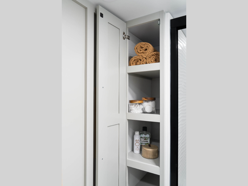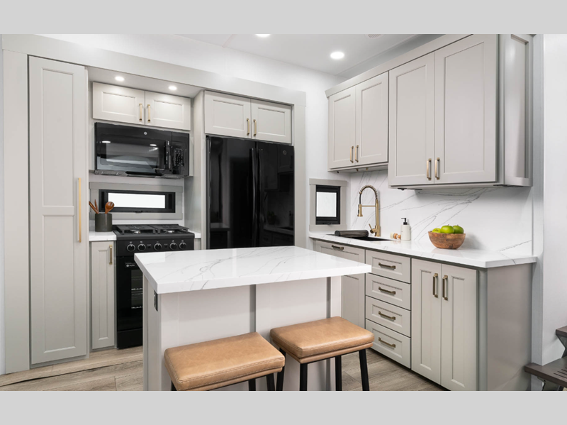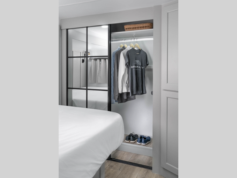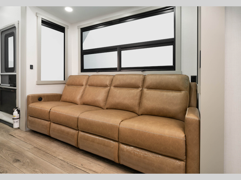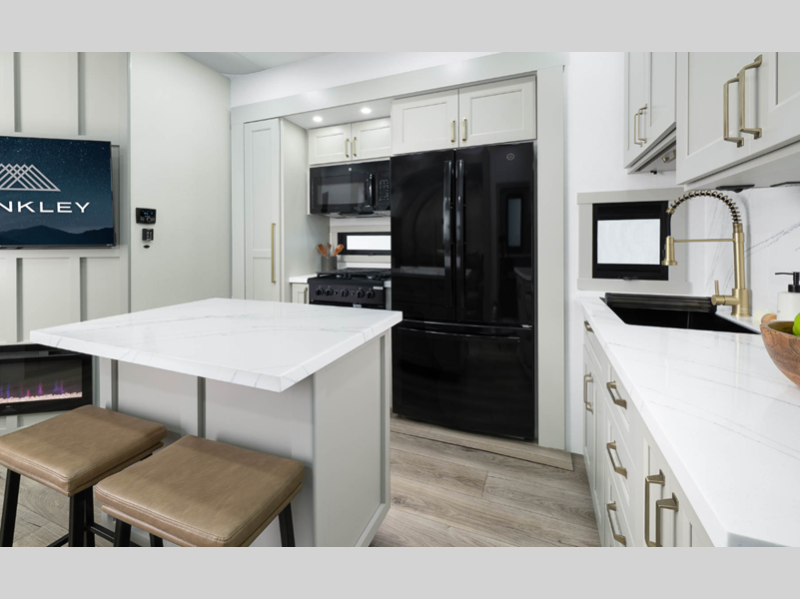 Additional stand-out highlights include a heated and enclosed underbelly with circulated forced air for added protection against the elements, 200Ah of lithium batteries that are self-heating, an impact guard fiber-reinforced poly roof, and Brinkley's Firefly Smart-Command Center for hassle-free access to your RVs functions. Inside, there are integrated day screens and blackout shades, residential solid surface countertops and backsplash, and Brinkley's CraftSense wood trim construction.