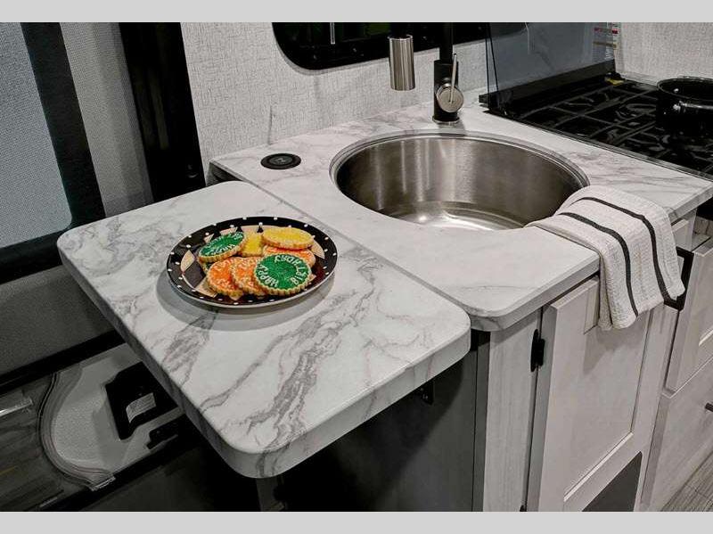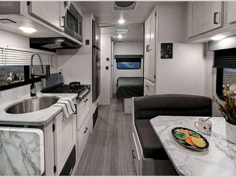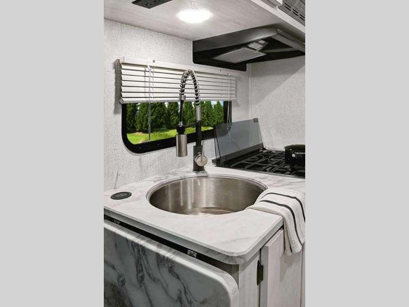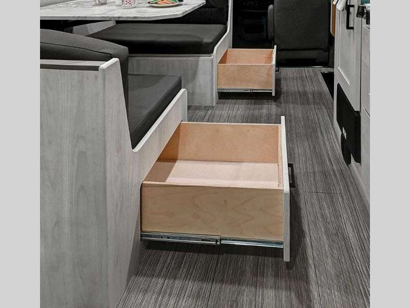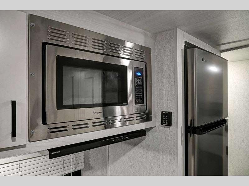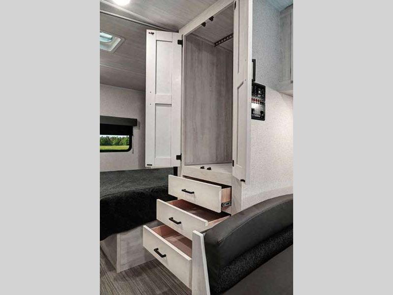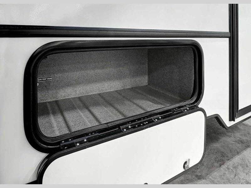 Each model is built to last with 2" Azdel composite exterior sidewalls, a TPO roof membrane, and a one-piece painted fiberglass front cap. You will love the soft close hardwood cabinet doors and drawers inside, along a high-altitude tankless water heater for endless hot showers.