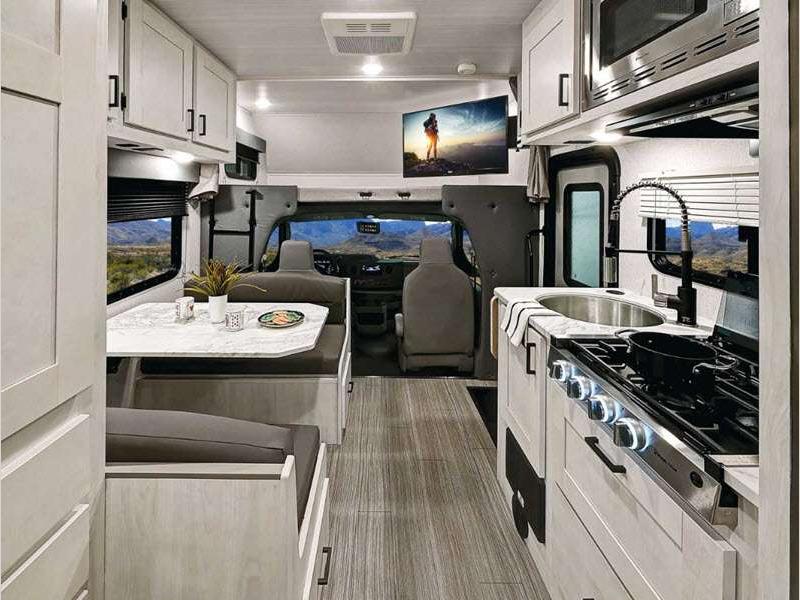 Sleeps 5 Slides 1 Length 23 ft 10 in Ext Width 8 ft 5 in Ext Height 11 ft 3 in Int Height 7 ft GVWR 12500 lbs Fresh Water Capacity 35 gals Grey Water Capacity 32 gals Black Water Capacity 27 gals Furnace BTU 30000 btu Generator 4500W Fuel Type Gasoline Chassis Ford E-350 Fuel Capacity 55 gals Wheelbase 158 in Number Of Bunks 1 Available Beds Queen Refrigerator Type 12V Dual Swing Refrigerator Size 10.7 cu ft Convection Cooking Yes Number of Awnings 1 Axle Weight Front 5000 lbs Axle Weight Rear 8500 lbs LP Tank Capacity 40 lbs Water Heater Type Tankless AC BTU 15000 btu TV Info 12V Smart TV Awning Info 14' Power with LED Light Strip Gross Combined Weight 18500 lbs Shower Type Standard Electrical Service 30 amp Similar Floorplans