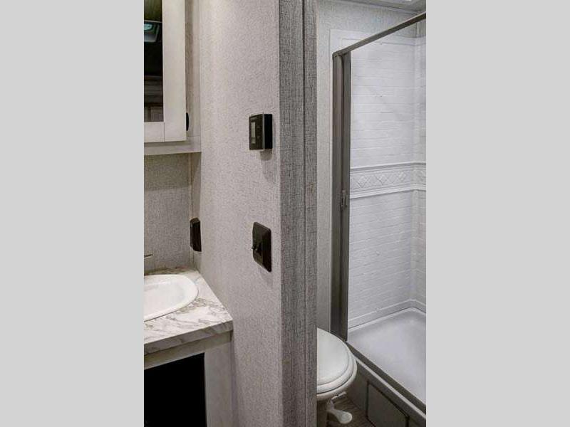 Sleeps 6 Length 29 ft 11 in Ext Width 8 ft 5 in Ext Height 11 ft 3 in Int Height 7 ft GVWR 14500 lbs Fresh Water Capacity 35 gals Grey Water Capacity 32 gals Black Water Capacity 32 gals Furnace BTU 30000 btu Generator 6000W Fuel Type Gasoline Chassis Ford E-450 Fuel Capacity 55 gals Wheelbase 190 in Number Of Bunks 1 Available Beds Queen Refrigerator Type 12V Dual Swing Refrigerator Size 10.7 cu ft Convection Cooking Yes Cooktop Burners 3 Number of Awnings 1 Axle Weight Front 5000 lbs Axle Weight Rear 9600 lbs LP Tank Capacity 40 lbs Water Heater Type Tankless AC BTU 15000 btu TV Info 12V Smart TV Awning Info 20' Power with LED Light Strip Gross Combined Weight 22000 lbs Shower Type Standard Electrical Service 50 amp Similar Floorplans