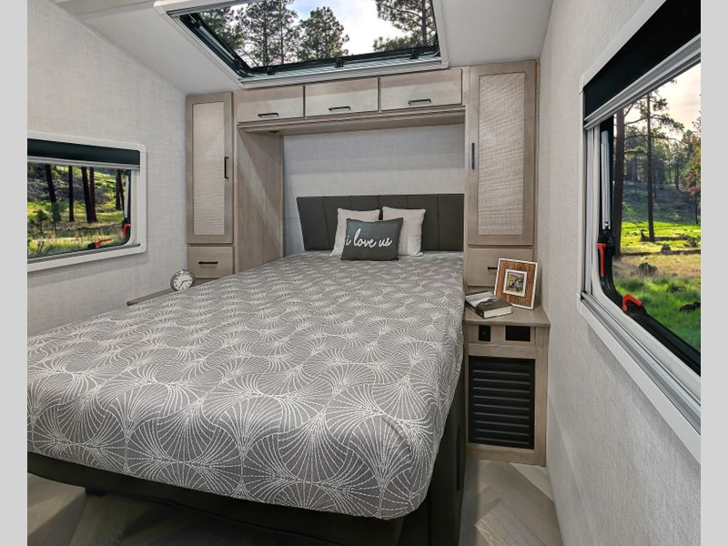 Sleeps 2 Slides 1 Length 29 ft 5 in Ext Width 8 ft Ext Height 11 ft 3 in Hitch Weight 740 lbs GVWR 8195 lbs Dry Weight 6110 lbs Cargo Capacity 2085 lbs Fresh Water Capacity 55 gals Grey Water Capacity 70 gals Black Water Capacity 35 gals Furnace BTU 30000 btu Available Beds Queen Refrigerator Type 12V Refrigerator Size 10.6 cu ft Convection Cooking Yes Cooktop Burners 2 Shower Size 30" x 36" Number of Awnings 1 LP Tank Capacity 40 lbs. Water Heater Type Tankless On Demand AC BTU 18000 btu TV Info 32" Smart HDTV Awning Info 20' Electric w/Dimmable LED Light Axle Count 2 Number of LP Tanks 2 Shower Type Standard Electrical Service 30 amp Solar Wattage 400 watts Similar Floorplans