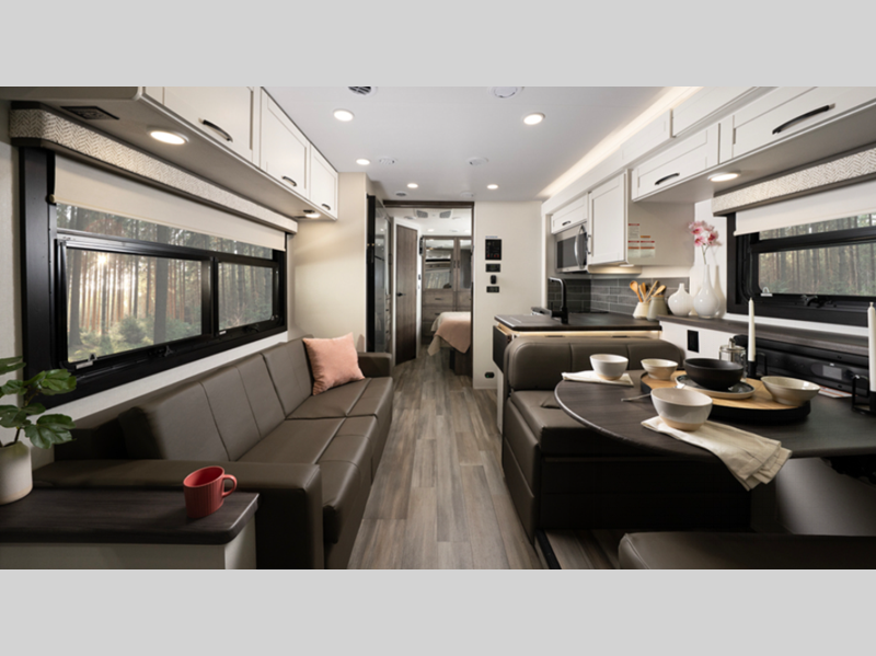 Sleeps 5 Slides 2 Length 29 ft 11 in Ext Width 8 ft 5 in Ext Height 12 ft 5 in Int Height 7 ft Interior Color Ashbrook, Farmhouse Exterior Color Standard Graphics. Full-Body Paint; Cerulean, Mirage, Echo, Horizon Hitch Weight 5000 lbs GVWR 18000 lbs Fresh Water Capacity 72 gals Grey Water Capacity 50 gals Black Water Capacity 49 gals Tire Size 245/70R19.5 Furnace BTU 30000 btu Generator 5,500W Fuel Type Gasoline Engine 7.3L V8 Chassis Ford F53 Horsepower 335 hp Fuel Capacity 80 gals Wheelbase 190 in Available Beds RV King Torque 468 ft-lb Refrigerator Type 12V Refrigerator Size 10 cu ft Cooktop Burners 3 Shower Size 30" x 36" Number of Awnings 1 Axle Weight Front 7000 lbs Axle Weight Rear 12000 lbs LP Tank Capacity 16.5 gals Water Heater Capacity 6 gal Water Heater Type Gas/Electric DSI AC BTU 28500 btu TV Info LR 39" LED HD Smart TV, Exterior LED HD Smart TV Awning Info 18' Electric with LED Lights Gross Combined Weight 23000 lbs Shower Type Standard Electrical Service 50 amp Similar Floorplans