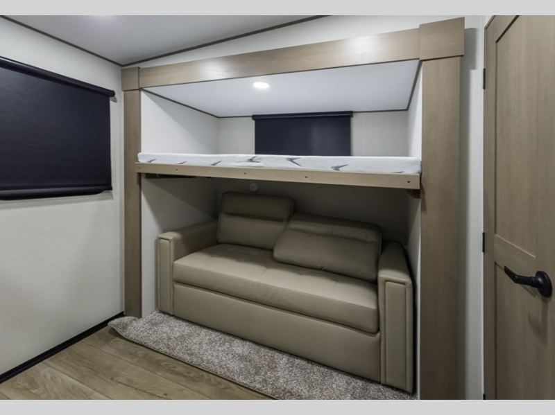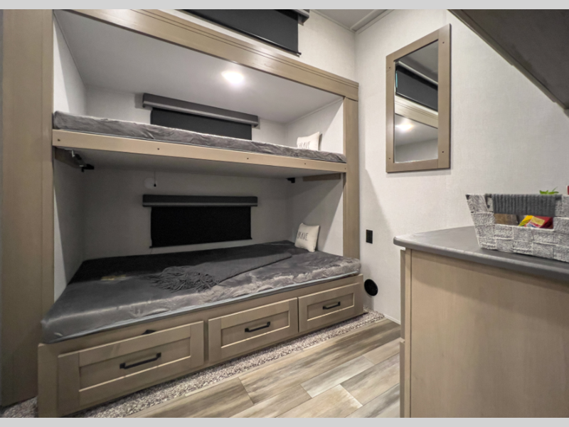 Sleeps 7 Slides 4 Length 36 ft 11 in Ext Width 8 ft Ext Height 12 ft 3 in Hitch Weight 2450 lbs GVWR 13995 lbs Dry Weight 11700 lbs Fresh Water Capacity 74 gals Grey Water Capacity 87 gals Black Water Capacity 87 gals Tire Size ST235/80R16RLE Furnace BTU 35000 btu Number Of Bunks 2 Available Beds Queen Refrigerator Type 12V Refrigerator Size 16 cu ft Cooktop Burners 3 Number of Awnings 2 LP Tank Capacity 30 lbs Water Heater Type On Demand AC BTU 15000 btu TV Info LR 40" TV Awning Info 13' & 10'6" One-Touch Electric LED Axle Count 2 Number of LP Tanks 2 Shower Type Radius Electrical Service 50 amp Solar Wattage 370 watts Similar Floorplans