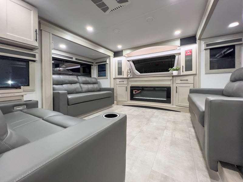 Sleeps 6 Slides 4 Length 42 ft 10 in Ext Width 8 ft 5 in Ext Height 13 ft 5 in Int Height 8 ft 1 in Exterior Color Standard Graphics or Aurora, Midnight, Pearl Full-Body Paint Options Hitch Weight 3200 lbs GVWR 23500 lbs Dry Weight 19000 lbs Fresh Water Capacity 83 gals Grey Water Capacity 159 gals Black Water Capacity 106 gals Tire Size ST215/75R 17.5 LRH Furnace BTU 35000 btu Number Of Bunks 2 Available Beds Queen Refrigerator Type Stainless Steel Refrigerator Size 20 cu ft Cooktop Burners 3 Shower Size 60" x 30" Number of Awnings 3 Axle Weight 8000 lbs LP Tank Capacity 30 lbs. Water Heater Type Tankless On Demand AC BTU 30000 btu TV Info LR LED 50" Smart TV, BR 40" TV, BNKRM 40" TV, EXT 50" TV Awning Info 15’ 5”, 7’ and 15’ 5" Power w/Integrated LED Lighting Axle Count 2 Number of LP Tanks 2 Shower Type Tub/Shower Combo Electrical Service 50 amp Similar Floorplans