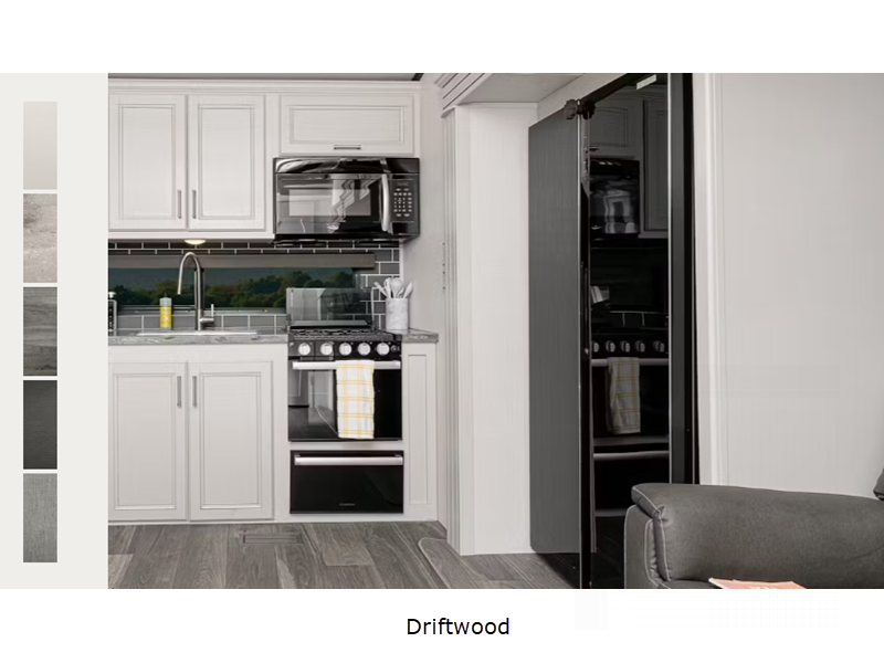 There is a Road Armor shock absorbing hitch pin for smooth towing and an engineered structural I-beam chassis with stamped steel cross-members and outriggers for added strength. You'll feel right at home with pleated privacy shades, residential, shaker style hardwood cabinet doors, and seamless pressed countertops.
