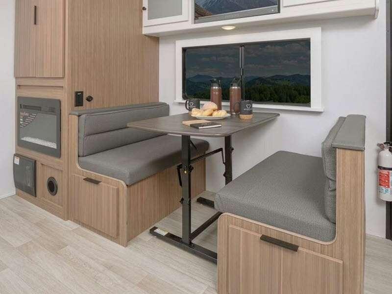 Each one is constructed with a seamless, laminated and gel-coated filon exterior, a fully walkable roof, and a high impact thermoset resin painted front cap for added protection. You'll love the residential and durable Beauflor® vinyl flooring inside, along with Cedar Frost interior decor and LED lights throughout. The exterior is just as accommodating with its outside shower, Edge View line lighting, plus power stabilizer jacks to name a few conveniences.