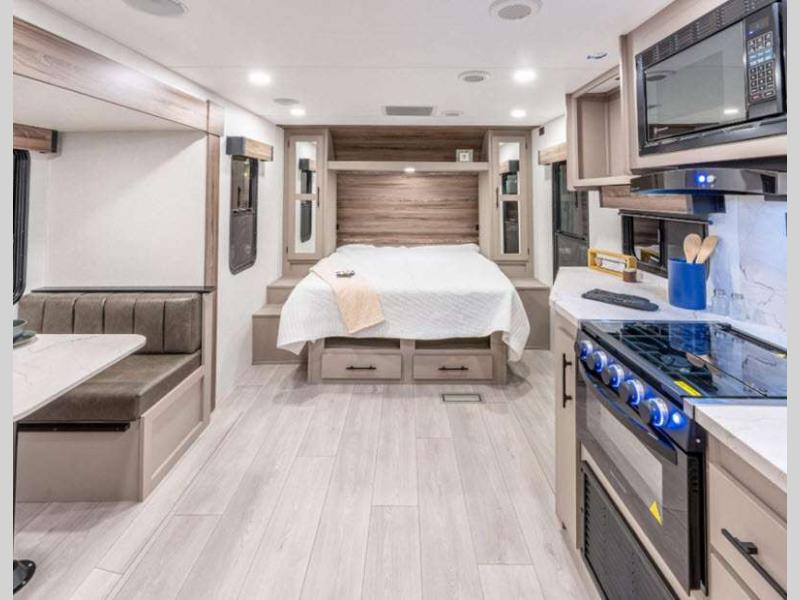 Sleeps 2 Slides 1 Length 27 ft Ext Width 8 ft Ext Height 10 ft 10 in Int Height 6 ft 6 in Interior Color Chocolate, Mink Hitch Weight 620 lbs GVWR 7000 lbs Dry Weight 5440 lbs Cargo Capacity 1560 lbs Fresh Water Capacity 45 gals Grey Water Capacity 64 gals Black Water Capacity 32 gals Tire Size 15" Furnace BTU 30000 btu Available Beds Queen Refrigerator Type 12V Refrigerator Size 10 cu ft Cooktop Burners 3 Shower Size 30" x 36" Number of Awnings 1 Axle Weight 4820 lbs LP Tank Capacity 20 lbs Water Heater Type Tankless AC BTU 13500 btu Awning Info 16' Power w/LED Light Strip Axle Count 2 Number of LP Tanks 2 Shower Type Standard Electrical Service 30 amp Similar Floorplans