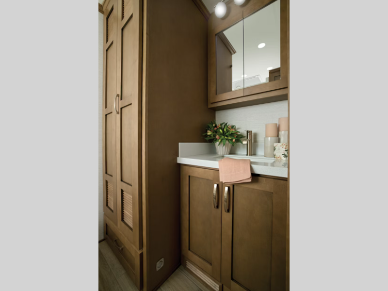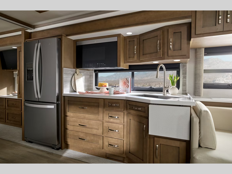 Each model is outfitted with Newmar's industry-exclusive full-paint Masterpiece Finish with multiple options for exterior colors, interior decors, and cabinetry stains so you can add your own touch. The kitchen is fit for any five-star chef with its all-electric flush-mount induction cooktop and Whirlpool 19.7-cubic foot refrigerator, and the entertainment features, like the LED 4K TVs in the living area and bedroom, are also top notch.