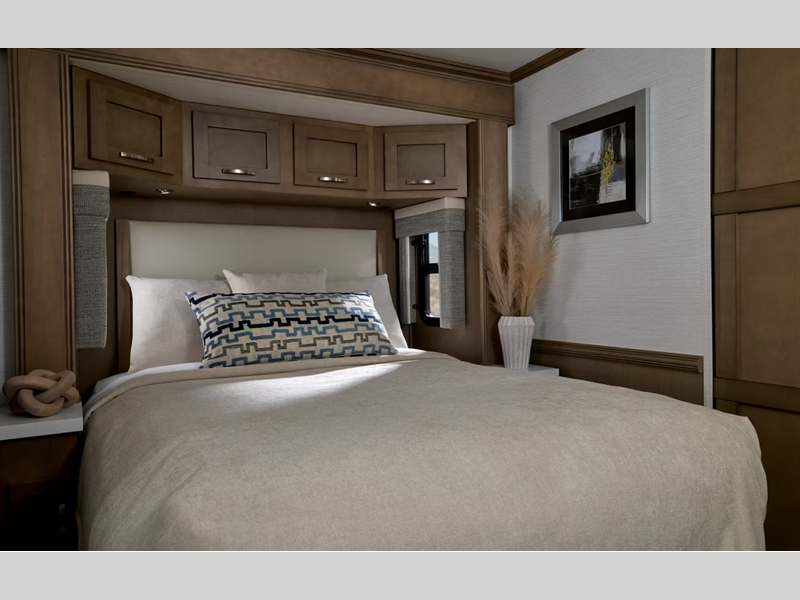 Sleeps 5 Slides 3 Length 37 ft 11 in Ext Width 8 ft 6 in Ext Height 13 ft Int Height 6 ft 11 in Interior Color Nola, Solano, Ashford Exterior Color Blanco, Chena, Chilkat Hitch Weight 20000 lbs GVWR 40000 lbs Dry Weight 33500 lbs Cargo Capacity 6500 lbs Fresh Water Capacity 150 gals Grey Water Capacity 60 gals Black Water Capacity 40 gals Furnace BTU 50000 btu Generator 8.0kW Cummins Onan Diesel Quiet Fuel Type Diesel Engine Cummins 8.9L Chassis Freightliner M-2 106 Horsepower 360 hp Fuel Capacity 100 gals Wheelbase 320 in Available Beds Queen Torque 1150 ft-lb Refrigerator Type Whirlpool Refrigerator Size 19.7 cu ft Convection Cooking Yes Cooktop Burners 2 Shower Size 40" x 30" Number of Awnings 1 Axle Weight Front 16000 lbs Axle Weight Rear 24000 lbs Water Heater Type Continuous AC BTU 30000 btu TV Info Samsung 4K LED TV; LR, BR, Ext. Awning Info Girard G2000 Integrated Side Awning Washer/Dryer Available Yes Gross Combined Weight 60000 lbs Shower Type Standard Electrical Service 50 amp Similar Floorplans