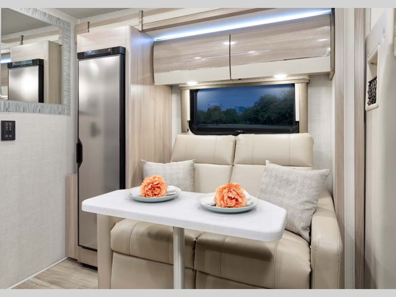 - Electric Leatherette Theater Seating with Footrests w/Tables IPO Dinette (24FB N/A on Canada Built Coaches) (Model Specific)
