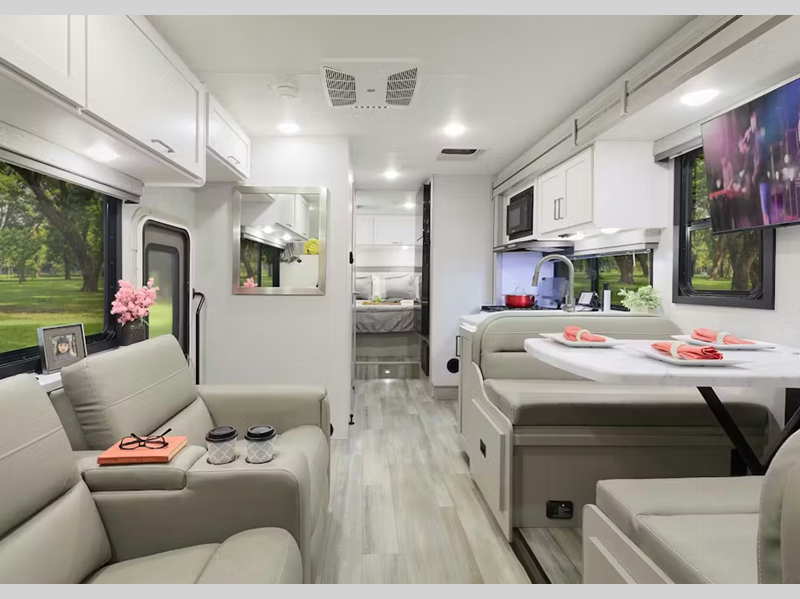 Sleeps 5 Slides 1 Length 24 ft 1 in Ext Width 8 ft 3 in Ext Height 11 ft Int Height 7 ft Interior Color Nantucket Blue ll, Sunlit Silver Exterior Color Standard Graphics Hitch Weight 8000 lbs GVWR 12500 lbs Fresh Water Capacity 40 gals Grey Water Capacity 35 gals Black Water Capacity 30 gals Furnace BTU 19000 btu Generator 4.0 kW Gas Dual Gas/LP Fuel Type Gas Engine 7.3L V8 Chassis Ford E-Series Horsepower 325 hp Fuel Capacity 55 gals Wheelbase 158 in Number Of Bunks 1 Available Beds RV Queen Torque 450 ft-lb Refrigerator Type 12V Convection Cooking Yes Cooktop Burners 2 Shower Size 24" x 36" Number of Awnings 1 LP Tank Capacity 40.9 lbs Water Heater Type Tankless AC BTU 13500 btu Basement Storage 30.9 cu. ft. TV Info Cab 32" Smart TV Awning Info 15' Power w/Integrated LED Lighting Gross Combined Weight 18500 lbs Shower Type Standard Electrical Service 30 amp Similar Floorplans