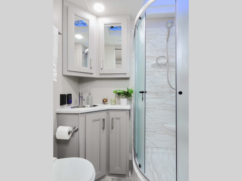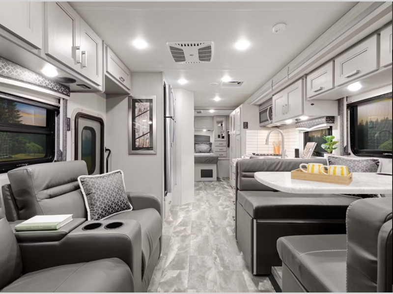 Sleeps 5 Slides 2 Length 33 ft 8 in Ext Width 8 ft 3 in Ext Height 12 ft 6 in Int Height 7 ft Interior Color Mariposa 3, Cosmic Strandz lll Exterior Color Full Body Paint; Crystal Cove lll, Mount Shasta 4, Saratoga 3, Westhaven Hitch Weight 10000 lbs GVWR 19500 lbs Fresh Water Capacity 75 gals Grey Water Capacity 47 gals Black Water Capacity 40 gals Furnace BTU 30000 btu Generator Onan RV QD 6000 Diesel Fuel Type Diesel Engine 6.7L Power Stroke 4 x 4 V8 Turbo Chassis Ford F-550 Horsepower 330 hp Fuel Capacity 68 gals Wheelbase 227 in Number Of Bunks 1 Available Beds RV Queen Torque 825 ft-lb Refrigerator Type Stainless Steel Residential Refrigerator Size 16 cu ft Convection Cooking Yes Cooktop Burners 3 Shower Size 30" x 36" Number of Awnings 1 LP Tank Capacity 68 lbs Water Heater Type Tankless Basement Storage 78 cu. ft. TV Info Smart TV; LR 40", BR 32", Ext. 32" Awning Info 14' Power with LED Lights Gross Combined Weight 40000 lbs Shower Type Standard Electrical Service 50 amp Similar Floorplans