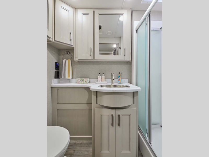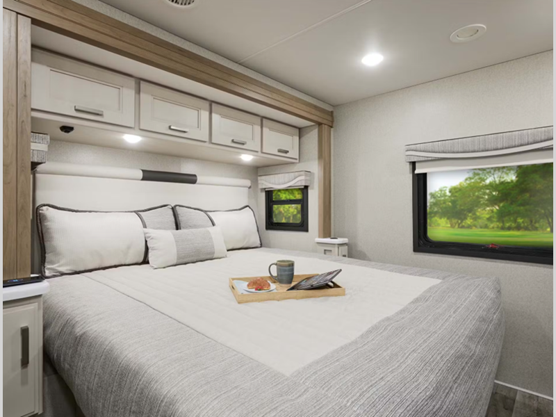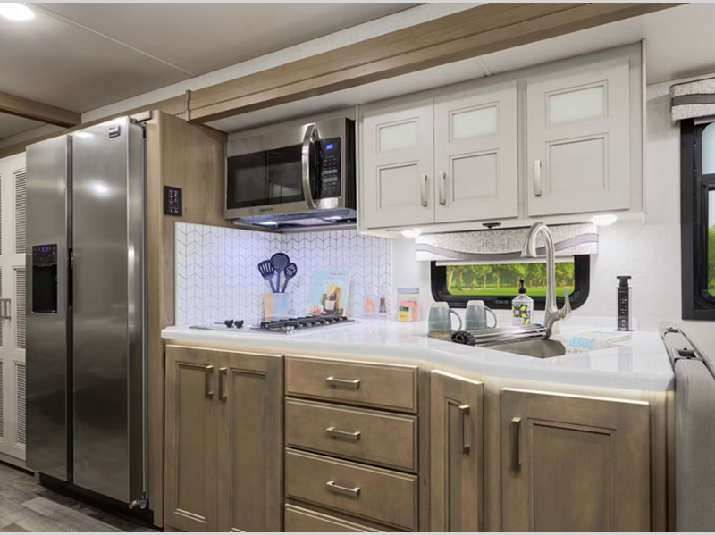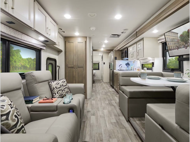 More standout features include the air ride adjustable cockpit seats for smooth traveling, a 15,000 lb. hitch and basement pass-through storage compartments perfect for surfboards, fishing poles, bikes, and any other item you want to bring along. There is a 100-watt solar charging system with control through the main multiplex control panel. The interior offers a fully upholstered booth dinette with the Dream Dinette mechanism for quick conversion from seating to sleeping space, and the gourmet kitchen is something to be seen.