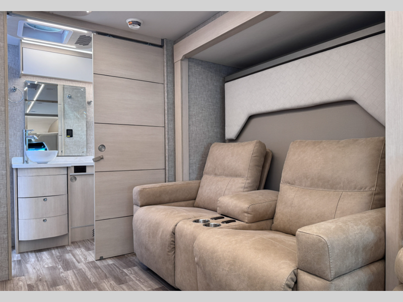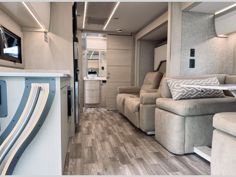 Each coach is built on a Mercedes-Benz 3500 XD dual wheel cutaway chassis with load adaptive electronic stability along with attention, traffic, active brake and lane keeping assist for safety. The chassis also has the SumoSprings ride assist system and the Lippert hydraulic leveling system for smooth driving and set up. Inside, you will love the handcrafted overhead cabinetry, dimmable LED lighting, solar and privacy shades, and many more comforts!